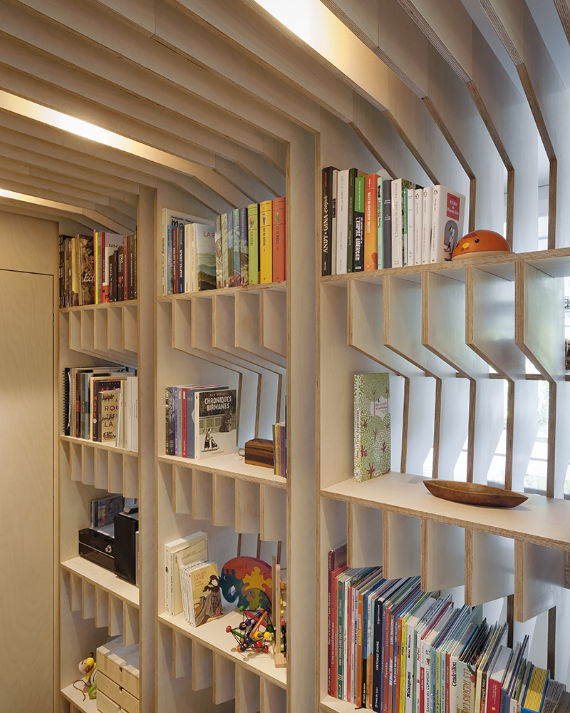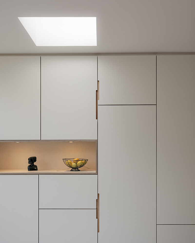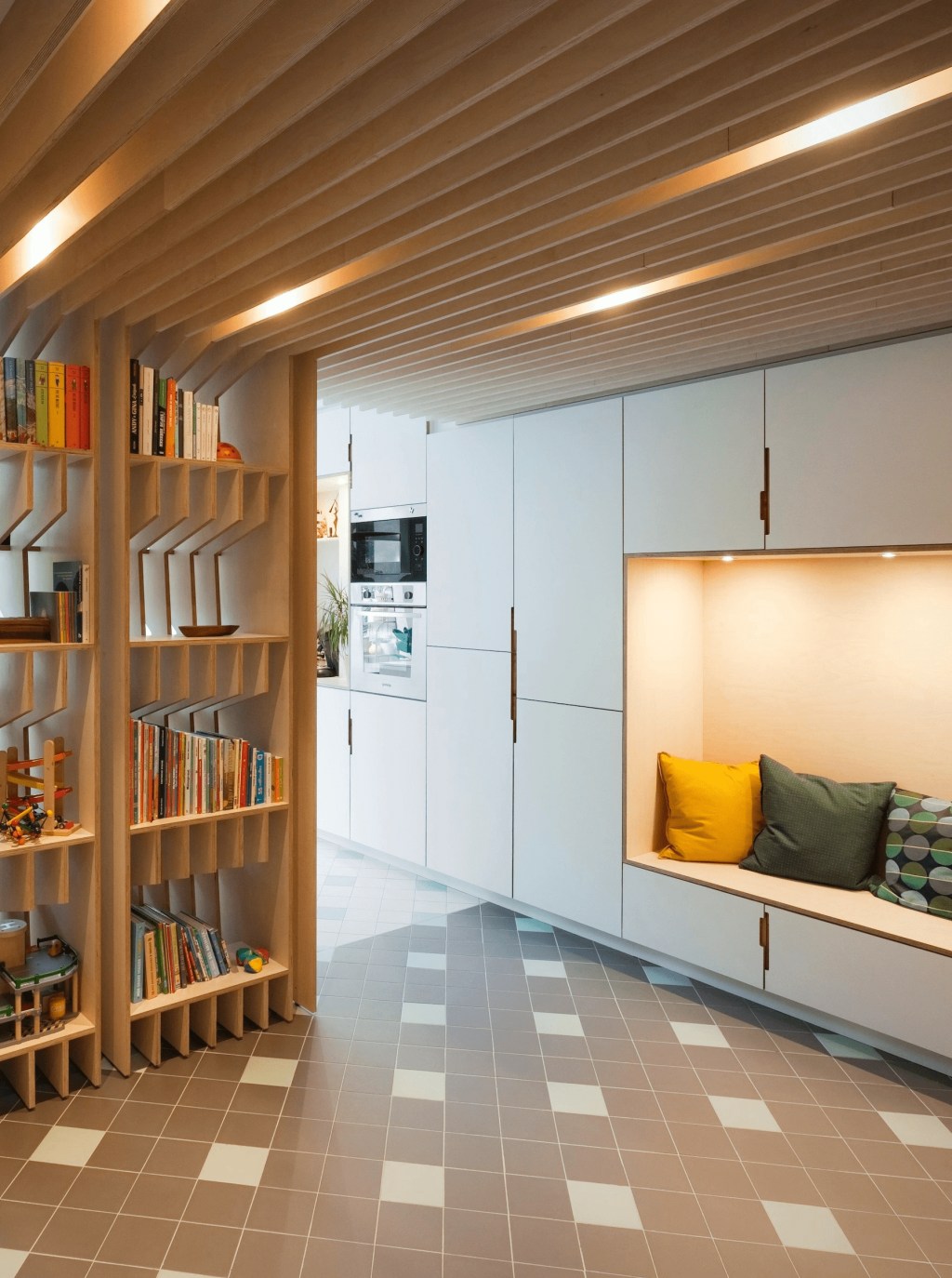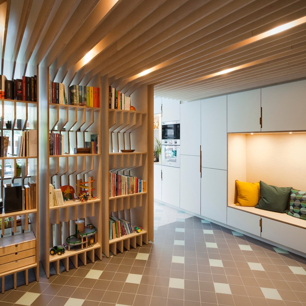 Située au sein du quartier du Terdelt sur la commune de Schaerbeek, cette habitation typique du début XXe possède les caractéristiques typiques de la petite maison de rangée bruxelloise. Avec ses deux pièces de vie en enfilade aboutissant dans une véranda et une circulation flanquée sur le coté, l’habitation présentait une configuration morcelée et centrée sur un espace sombre et exigu offrant peu de rapports visuels avec l’environnement extérieur. En 2015, un jeune couple d’infirmiers avec deux enfants, alors en bas âge, font l’acquisition de cette maison et décident d’adapter les lieux pour les rendre plus conformes à leur mode de vie. Leur profession ne leur laissant que peu de moments en famille, l’un des enjeux de l’intervention était d’ouvrir et reconnecter les espaces et fonctions de l’habitation en veillant à leur conférer une identité singulière. Tout en servant de zone de jeu, le meuble-bibliothèque se présente comme un espace à part entière qui articule des ambiances distinctes en filtrant subtilement la lumière et les vues entre l’avant et l’arrière de la maison. En jouant sur les contrastes et les effets de profondeur, l’architecture, le mobilier et les matières (bouleau/ grès cérame/ corian) viennent articuler l’atmosphère calme du salon et celle plus ouverte et lumineuse de la cuisine /salle-à-manger.