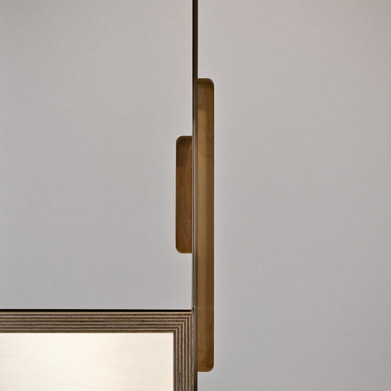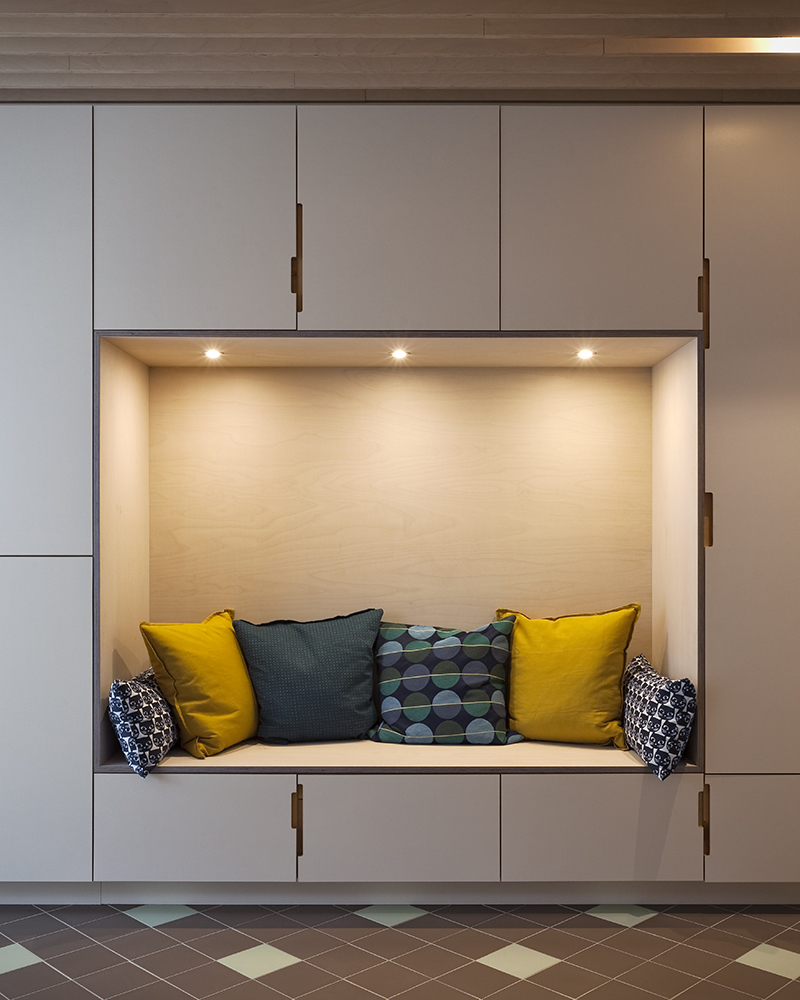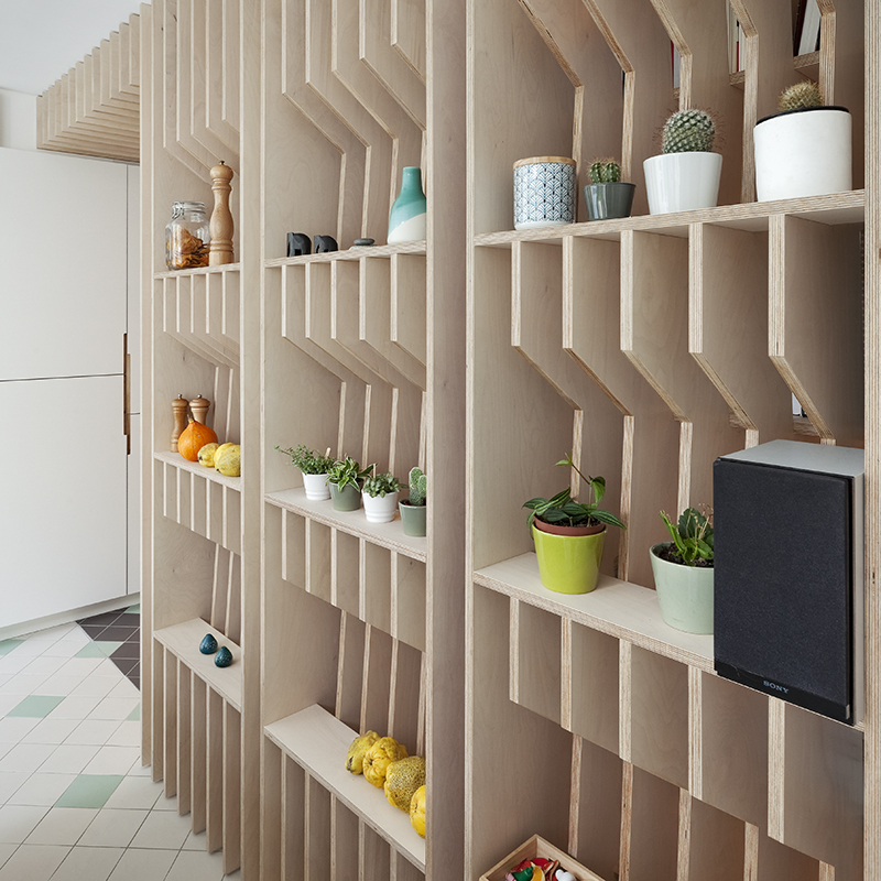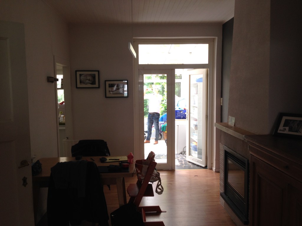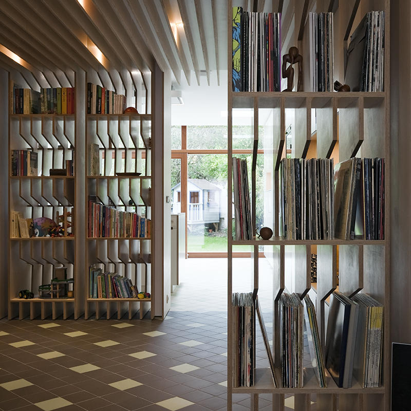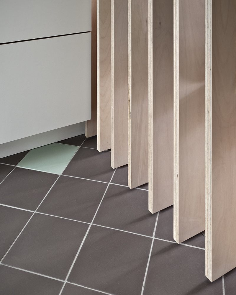 Située au sein du quartier du Terdelt sur la commune de Schaerbeek, cette habitation typique du début XXe possède les caractéristiques typiques de la petite maison de rangée bruxelloise. Avec ses deux pièces de vie en enfilade aboutissant dans une véranda et une circulation flanquée sur le coté, l’habitation présentait une configuration morcelée et centrée sur un espace sombre et exigu offrant peu de rapports visuels avec l’environnement extérieur. En 2015, un jeune couple d’infirmiers avec deux enfants, alors en bas âge, font l’acquisition de cette maison et décident d’adapter les lieux pour les rendre plus conformes à leur mode de vie. Leur profession ne leur laissant que peu de moments en famille, l’un des enjeux de l’intervention était d’ouvrir et reconnecter les espaces et fonctions de l’habitation en veillant à leur conférer une identité singulière. Tout en servant de zone de jeu, le meuble-bibliothèque se présente comme un espace à part entière qui articule des ambiances distinctes en filtrant subtilement la lumière et les vues entre l’avant et l’arrière de la maison. En jouant sur les contrastes et les effets de profondeur, l’architecture, le mobilier et les matières (bouleau/ grès cérame/ corian) viennent articuler l’atmosphère calme du salon et celle plus ouverte et lumineuse de la cuisine /salle-à-manger.