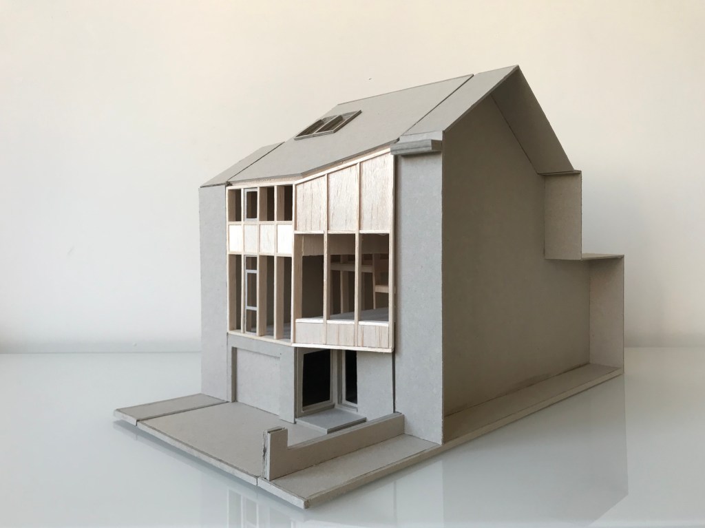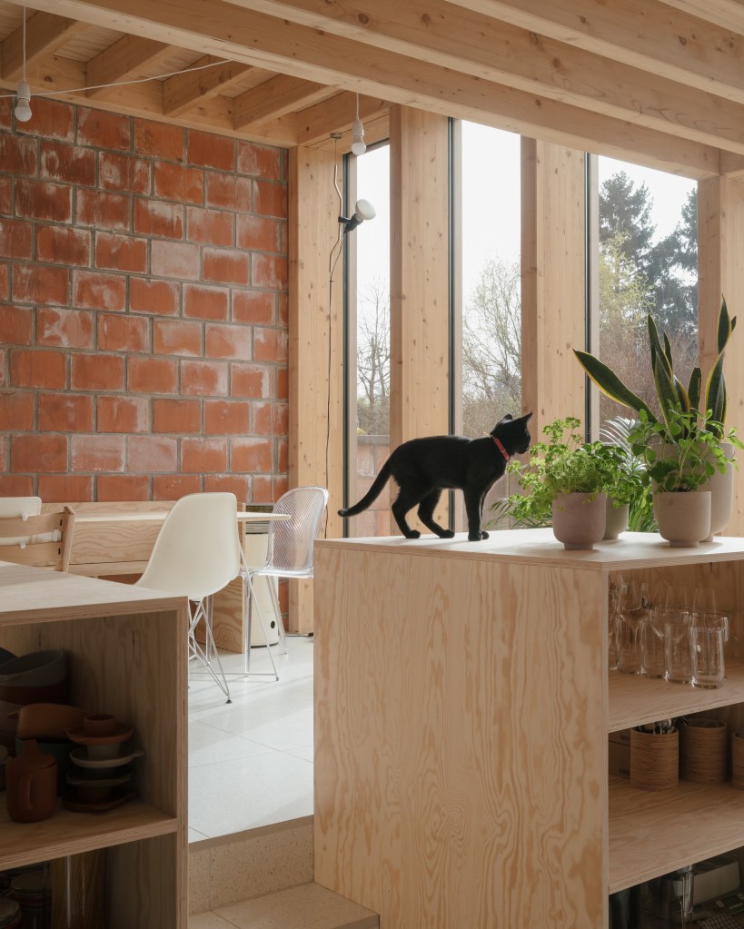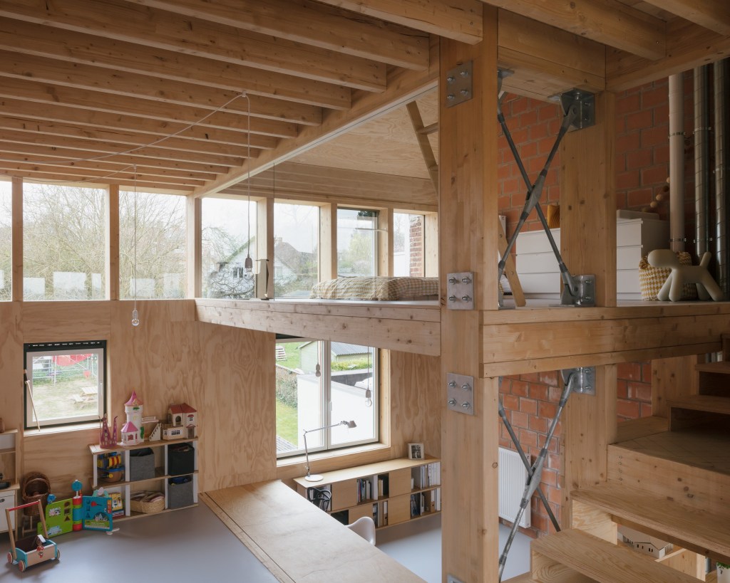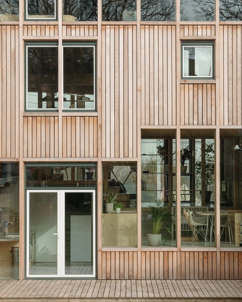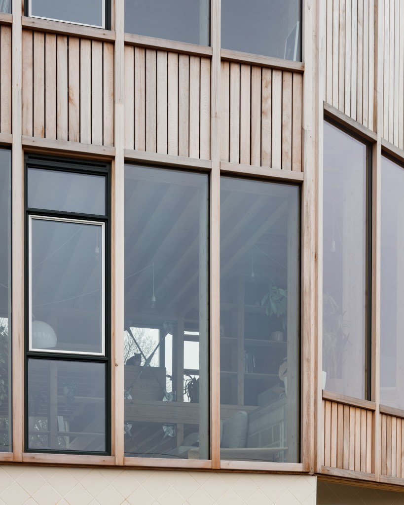 Ce jeu de niveaux et d’ouvertures des espaces est aussi lisible en façade et les matériaux ont été choisis pour reprendre l’expression de la structure de la construction en ossature bois.