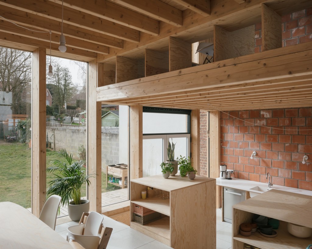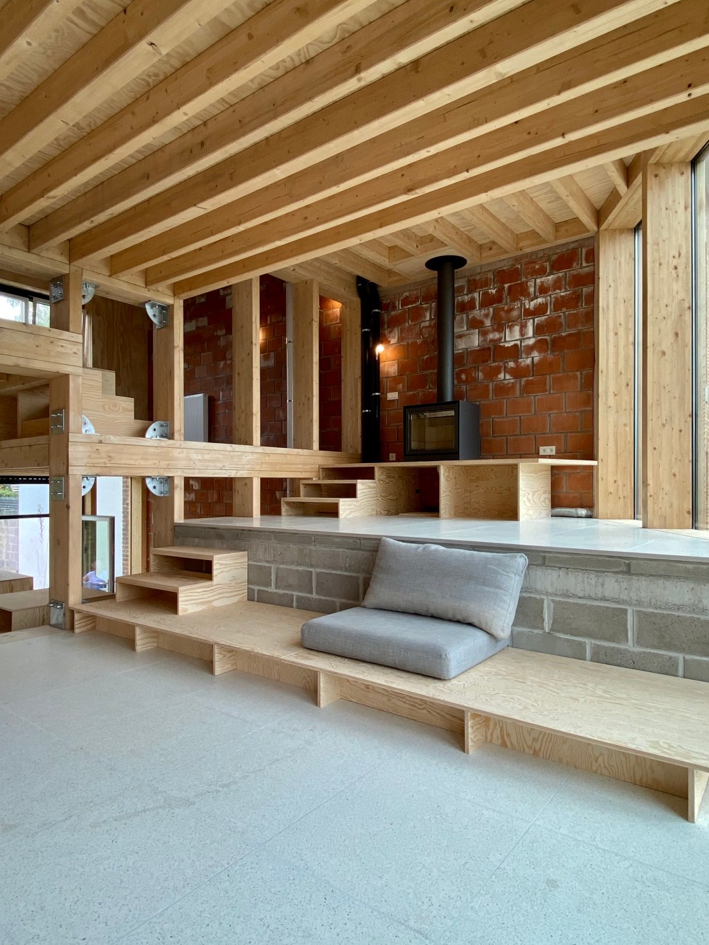 A l’intérieur, les espaces se succèdent dans un travail de séquence en demi-niveaux, ou plutôt en quarts de niveau. Articulés par des éléments de mobilier intégrés, les différences de hauteurs de planchers permettent d’organiser les espaces de l’habitation de manière très ouverte. Il y a très peu de cloisons et l’intimisation graduelle se crée par l’ascension progressive des plateformes.