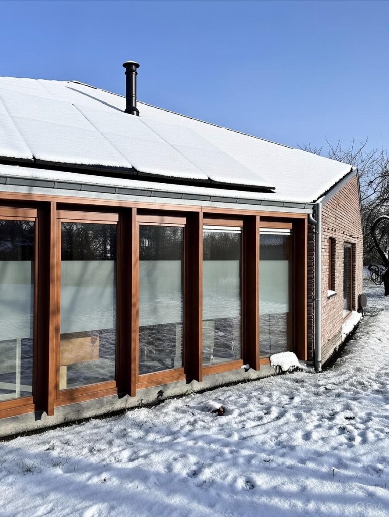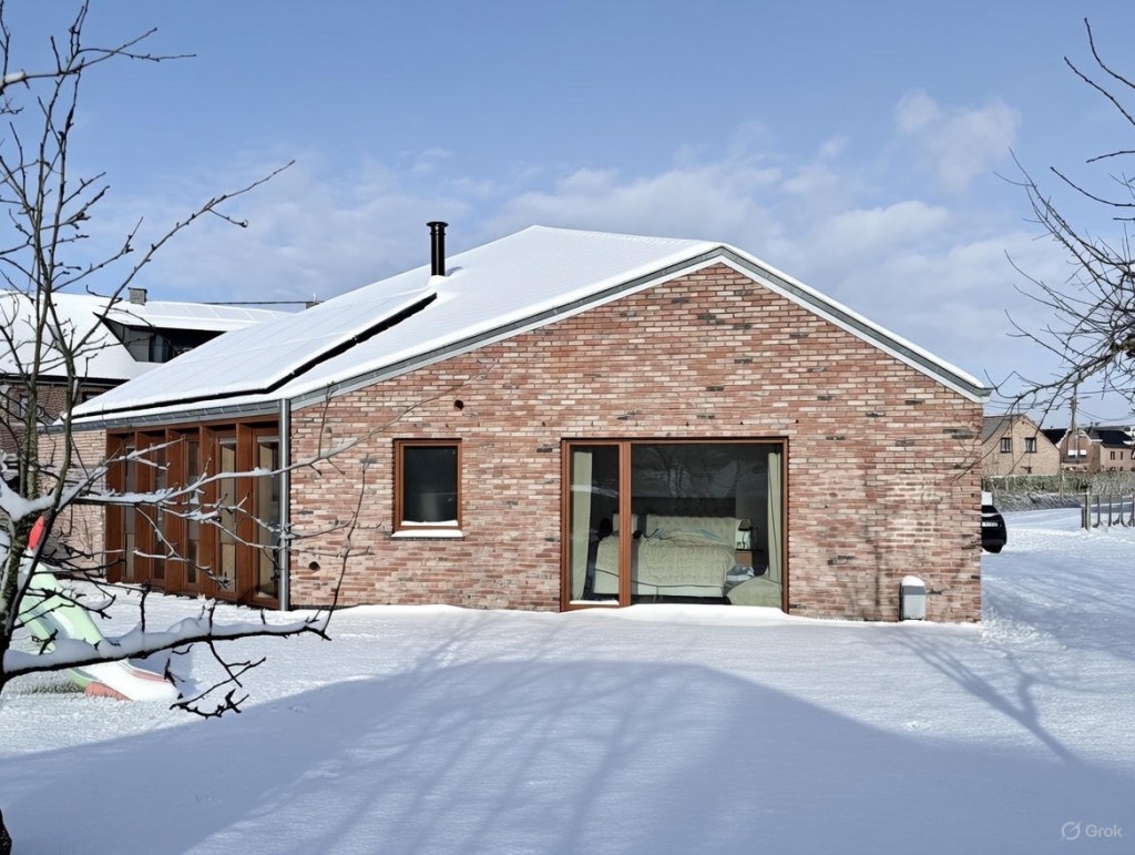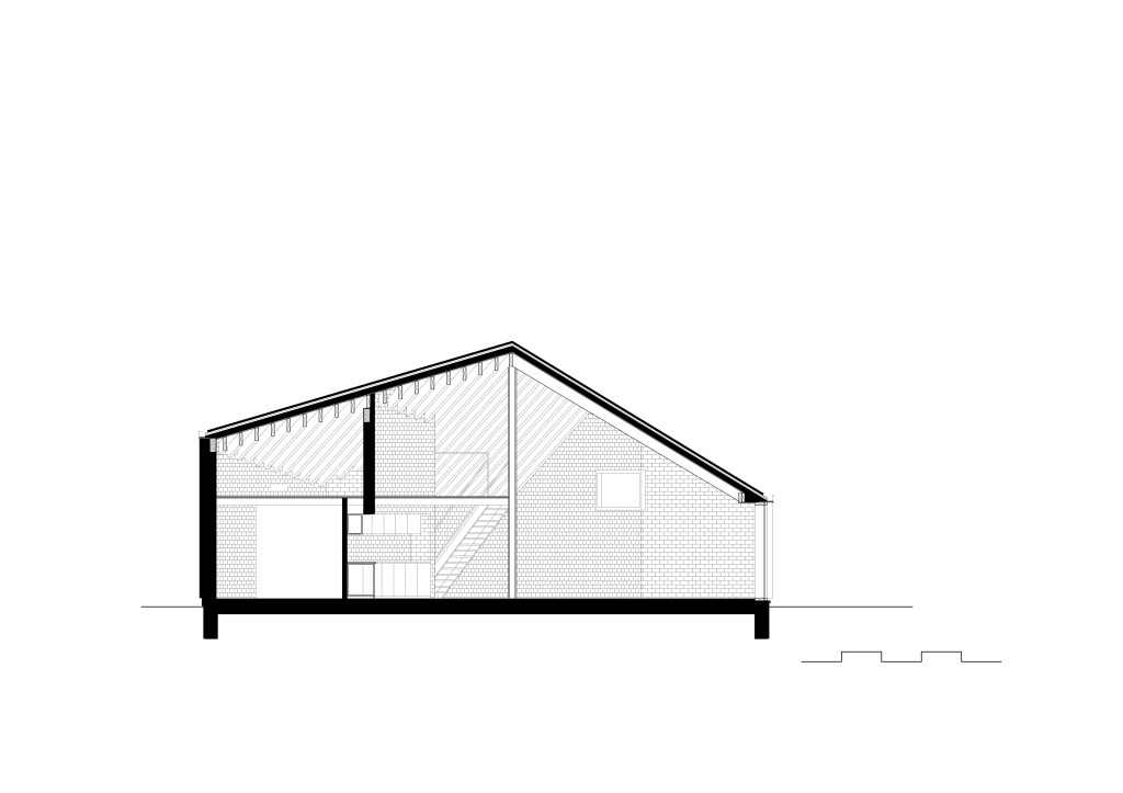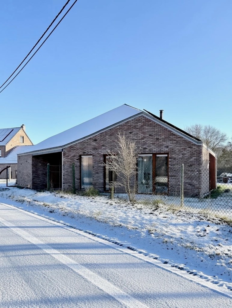 Le projet s’ancre dans son environnement par une matérialité et des volumes faisant écho aux constructions voisines sans relever du mimétisme (brique en façade, toiture en ardoises, gabarit bas et étiré) . Cette continuité sert au contraire de point d’appui à une réinterprétation contemporaine de l’habitat rural, où l’enveloppe sobre contraste avec une organisation intérieure plus libre et expressive.