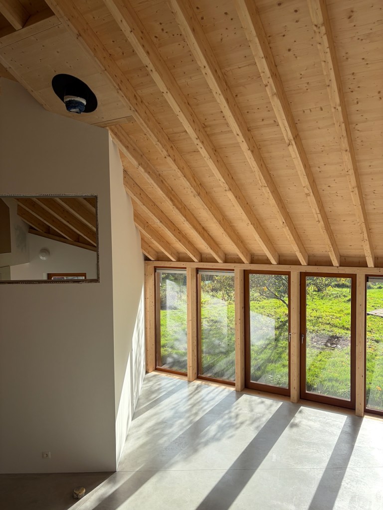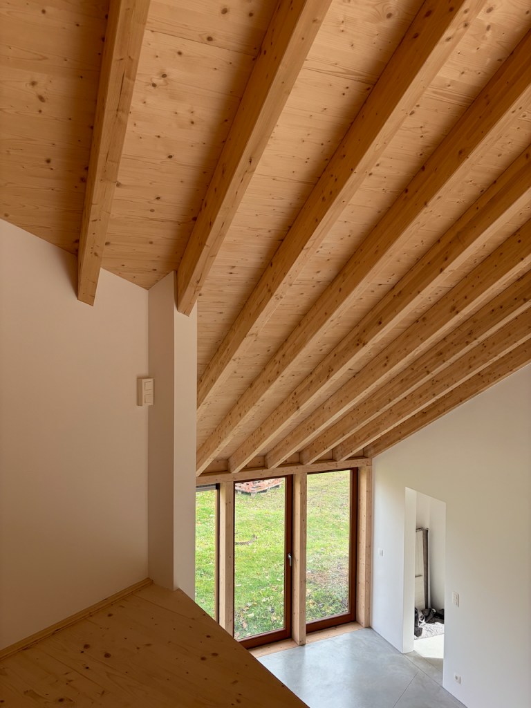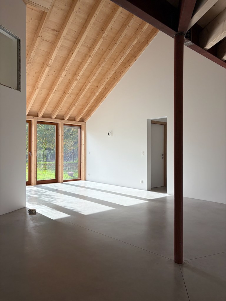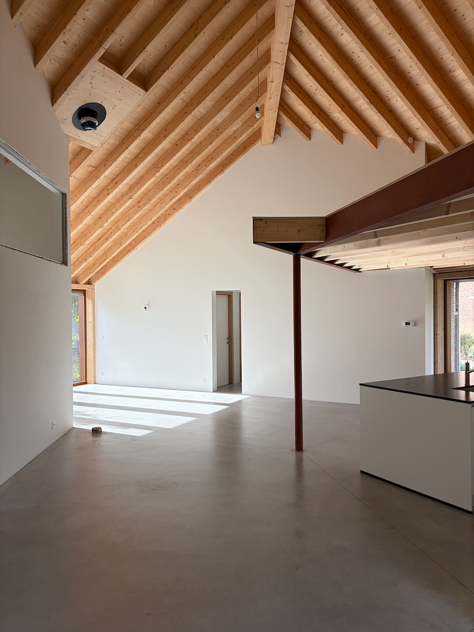 À l’intérieur, de généreuses hauteurs sous toiture, la structure bois apparente et une continuité visuelle entre les espaces composent une expérience domestique contemporaine en tension avec l’apparente simplicité du volume bâti.