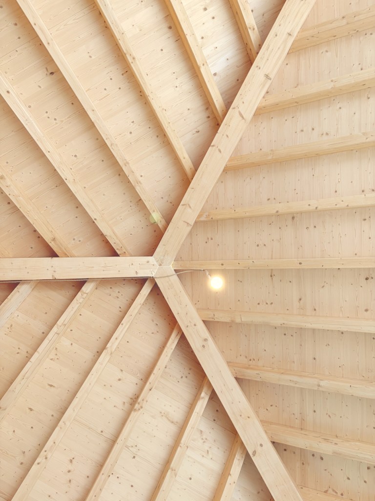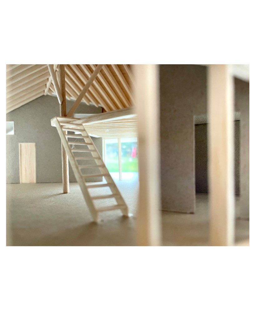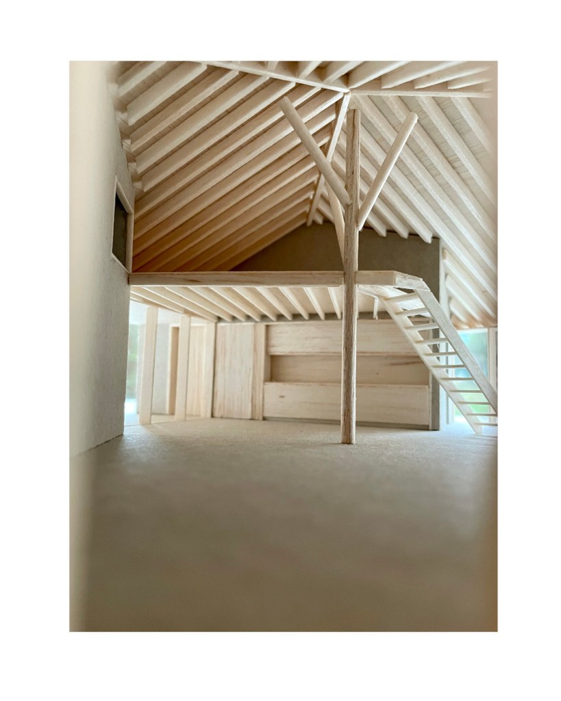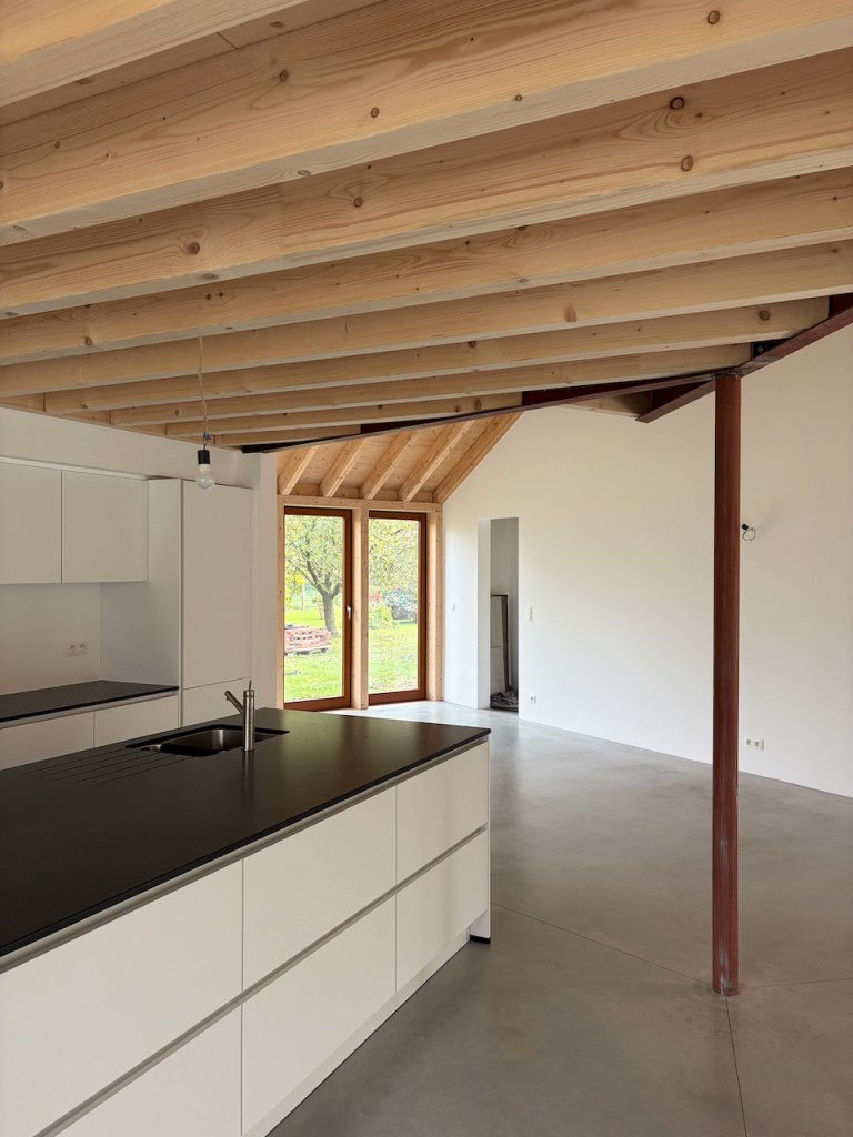 À l’intérieur, de généreuses hauteurs sous toiture, la structure bois apparente et une continuité visuelle entre les espaces composent une expérience domestique contemporaine en tension avec l’apparente simplicité du volume bâti.