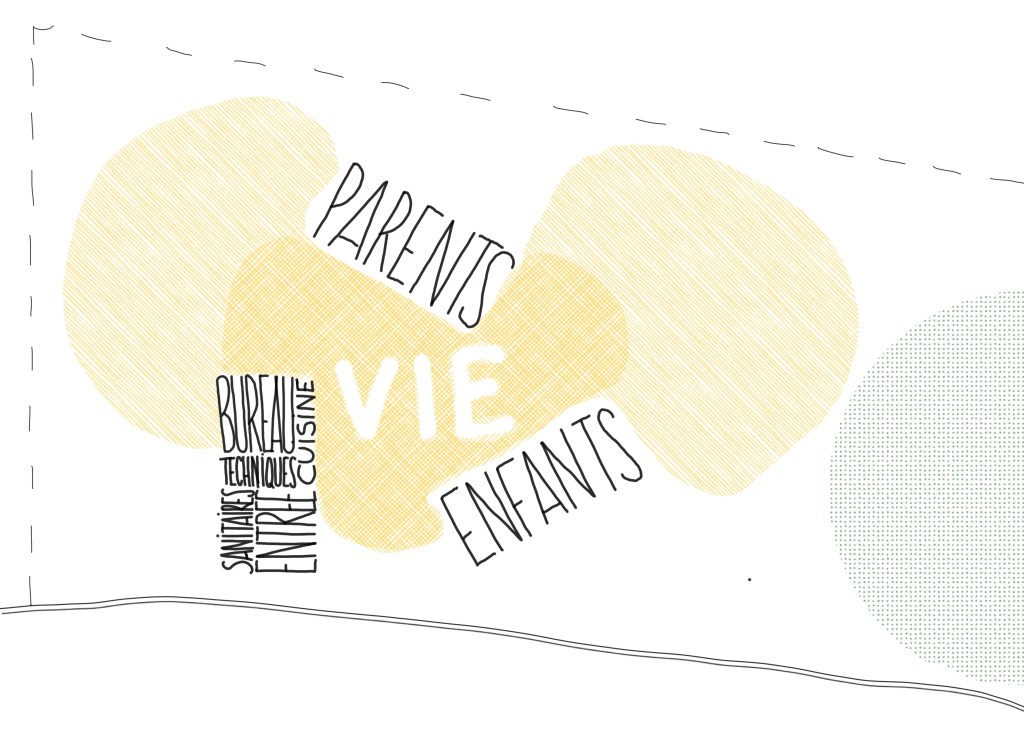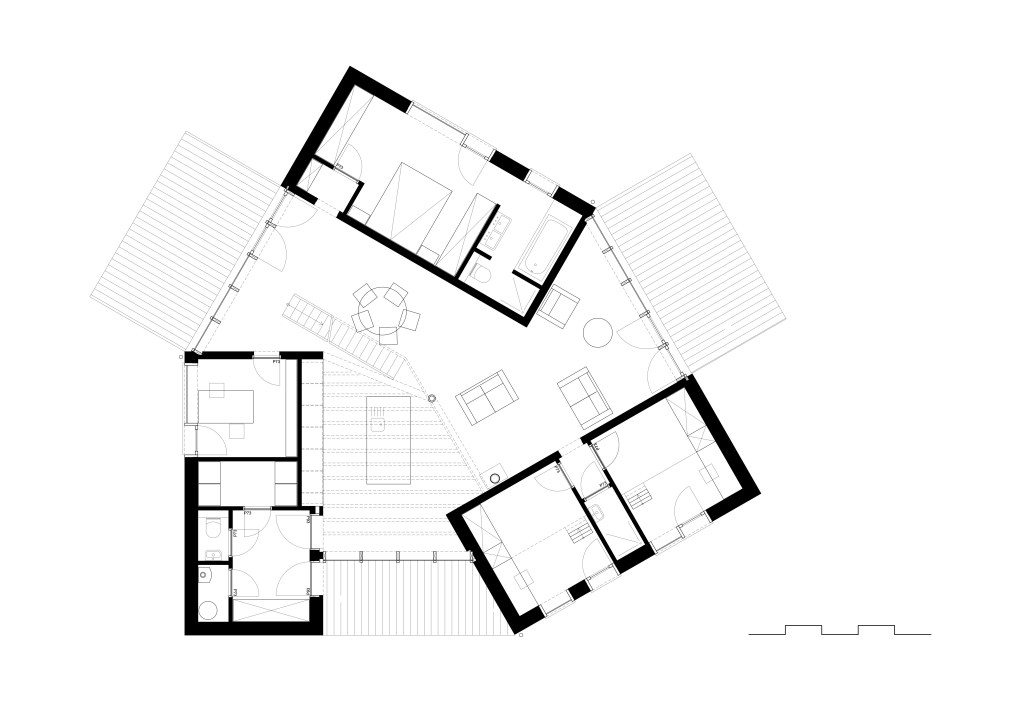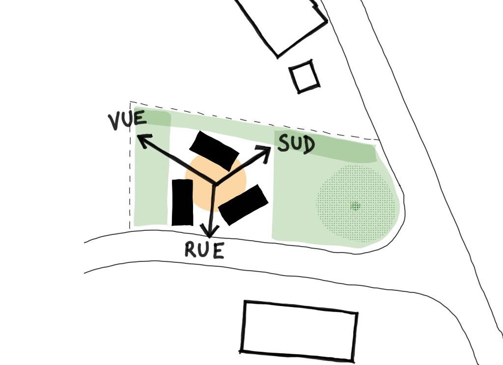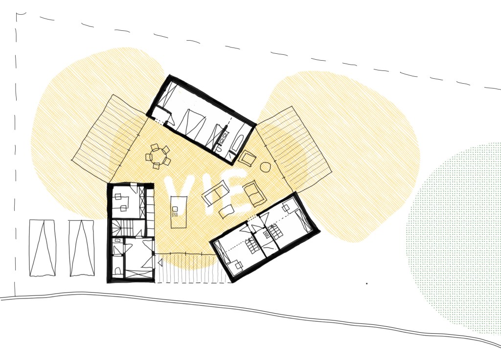 L’habitation se déploie autour d’un espace de vie central, cœur du projet, autour duquel s’articulent les différentes entités programmatiques. La fragmentation des volumes, disposés en éventail, limite l’impact visuel depuis l’espace public tout en favorisant des cadrages sur le paysage et un ensoleillement optimal des espaces de vie.